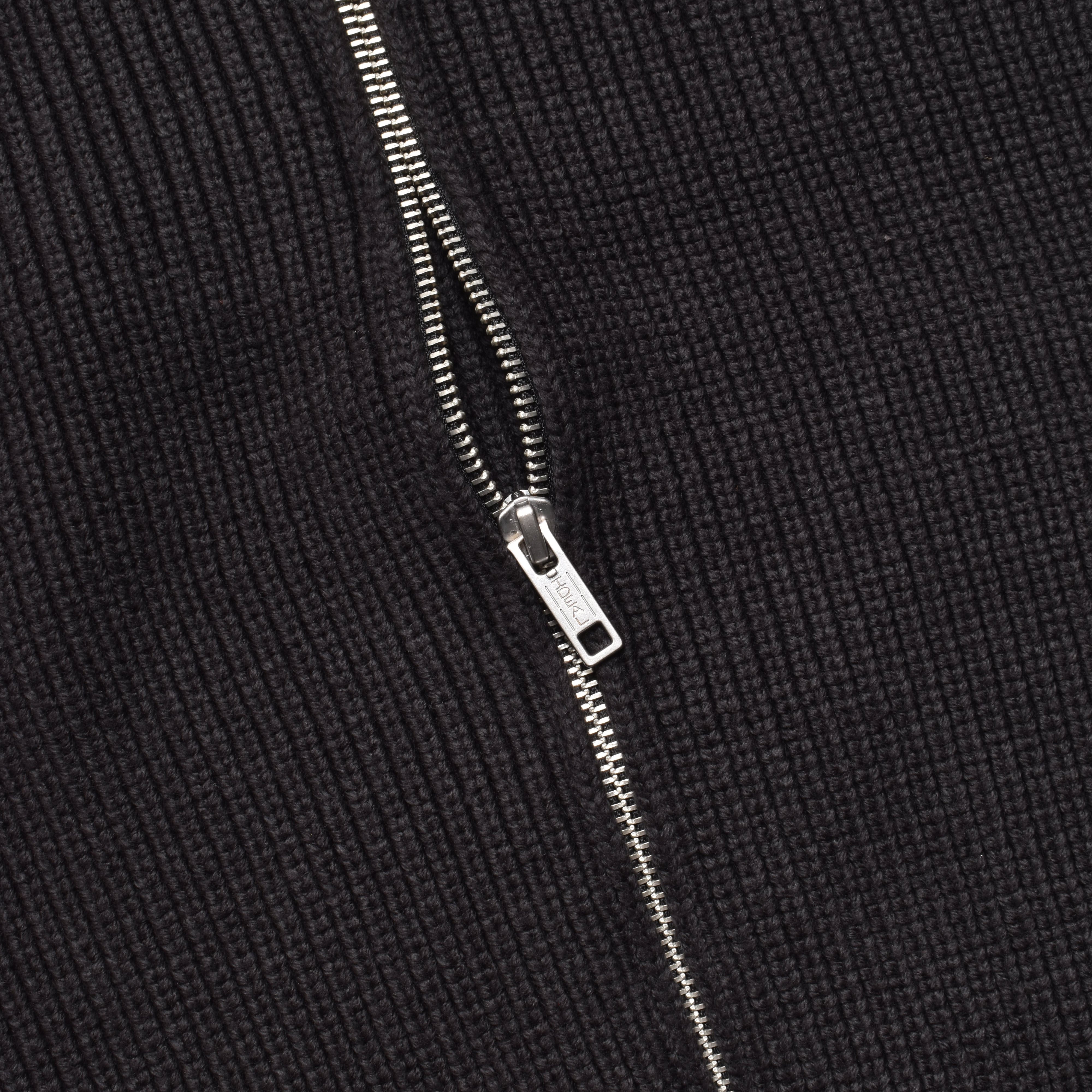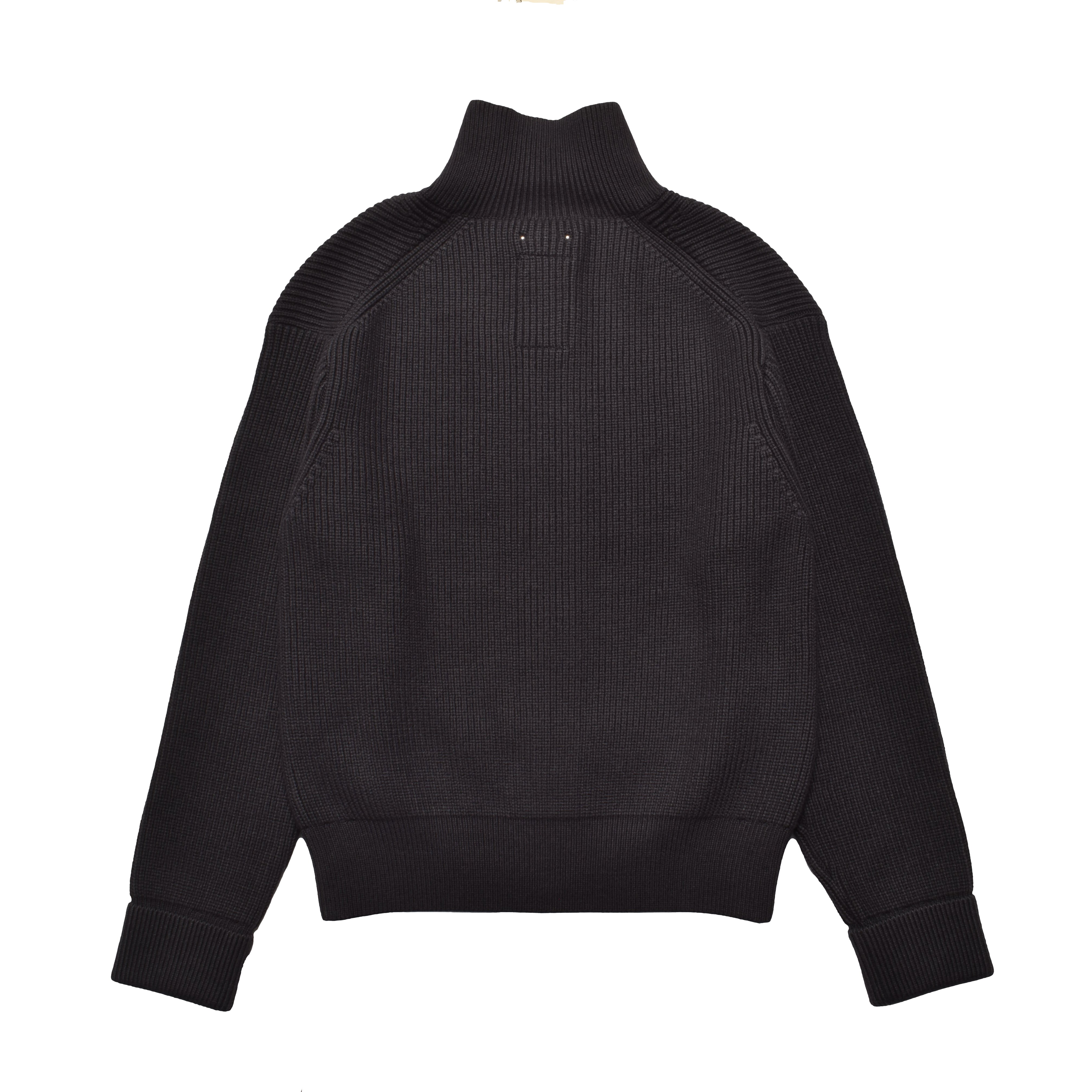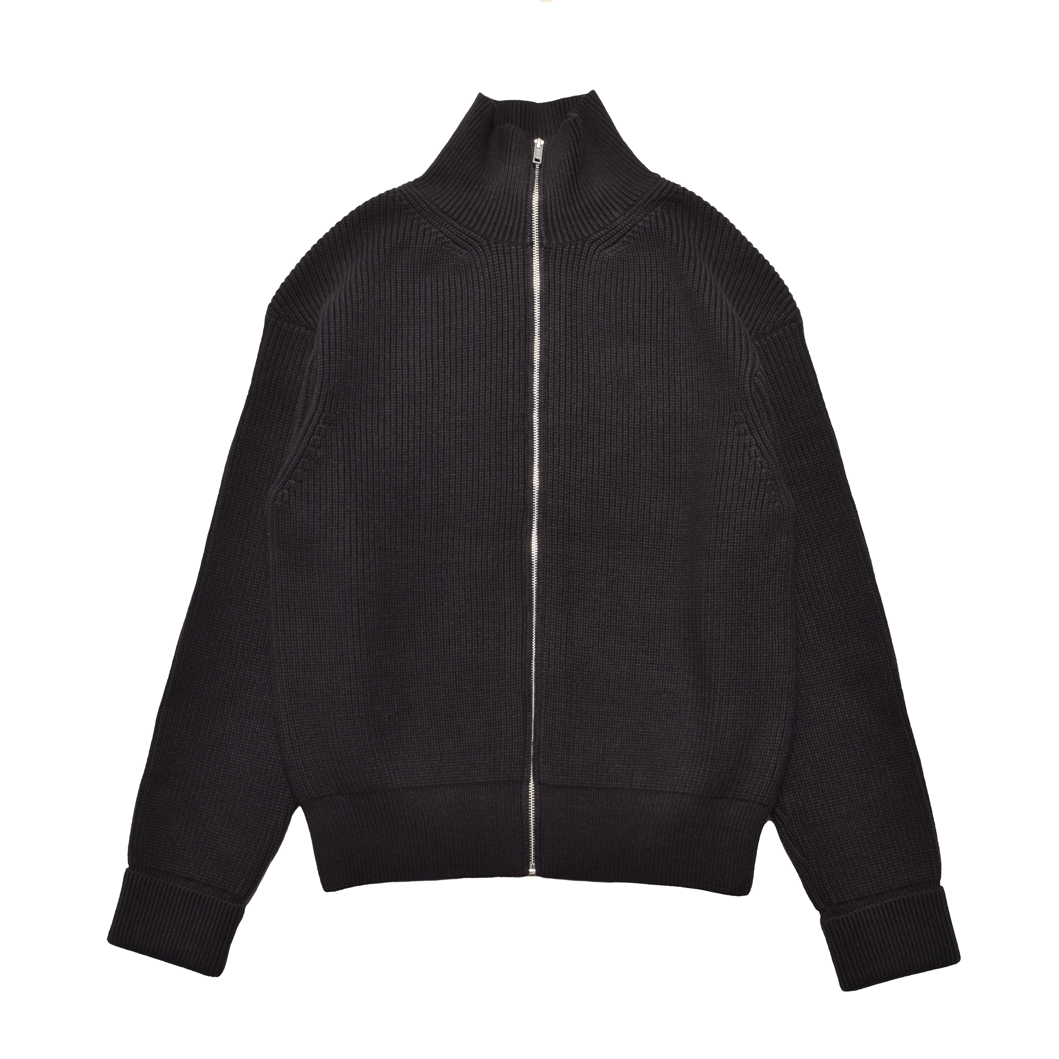 敢えて撚りをかけずコットン本来の柔らかな風合いと光沢を引き出した太番手のニット糸を用い、最大限度目を詰めることで重厚感を演したジップアップトラッカーニットブルゾン