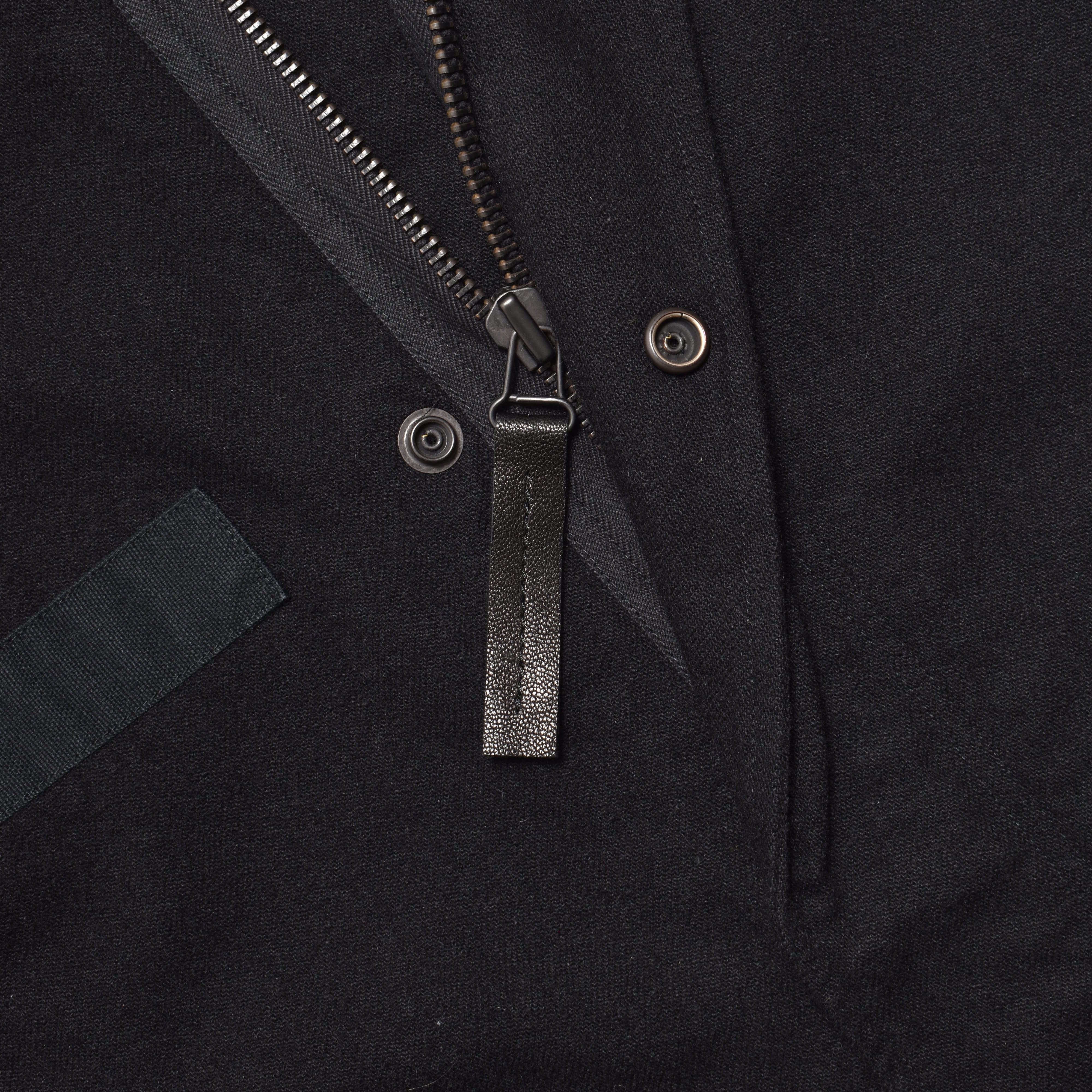 敢えてコットンウールファブリックで製作し、ファスナーやドローコードなどのパーツはもちろんのこと、補強布にレザーパーツを用いるなどオリジナリティも表現。