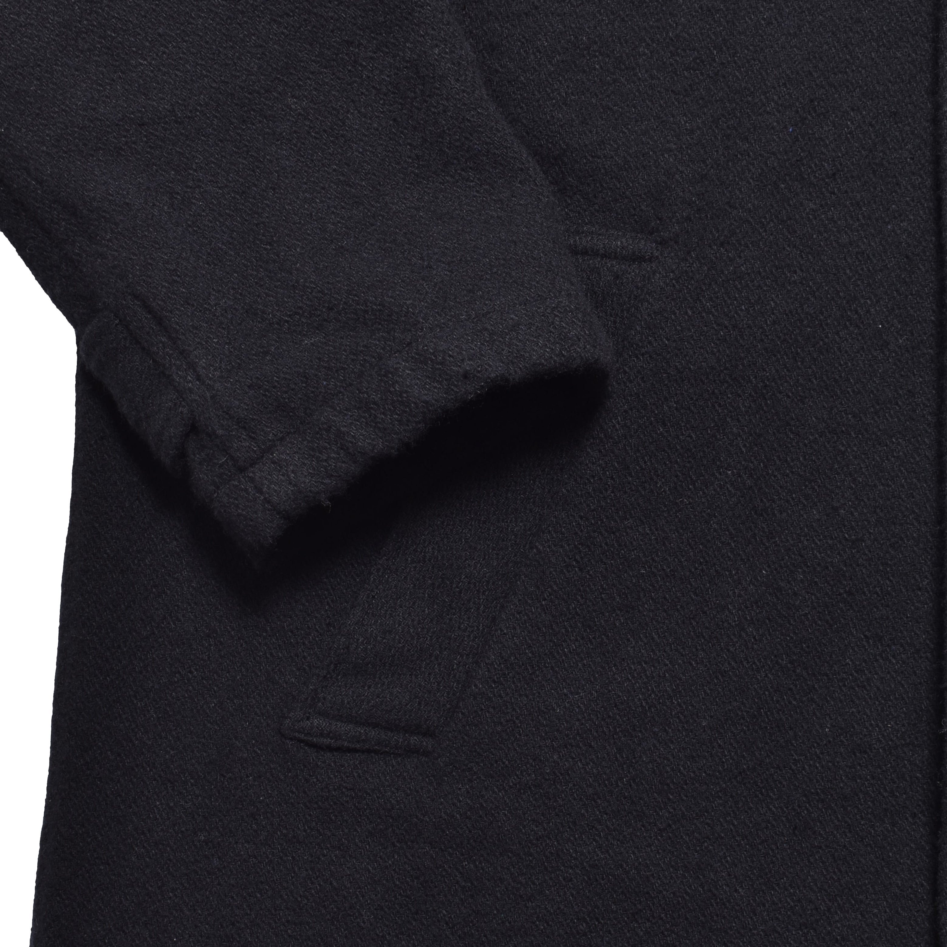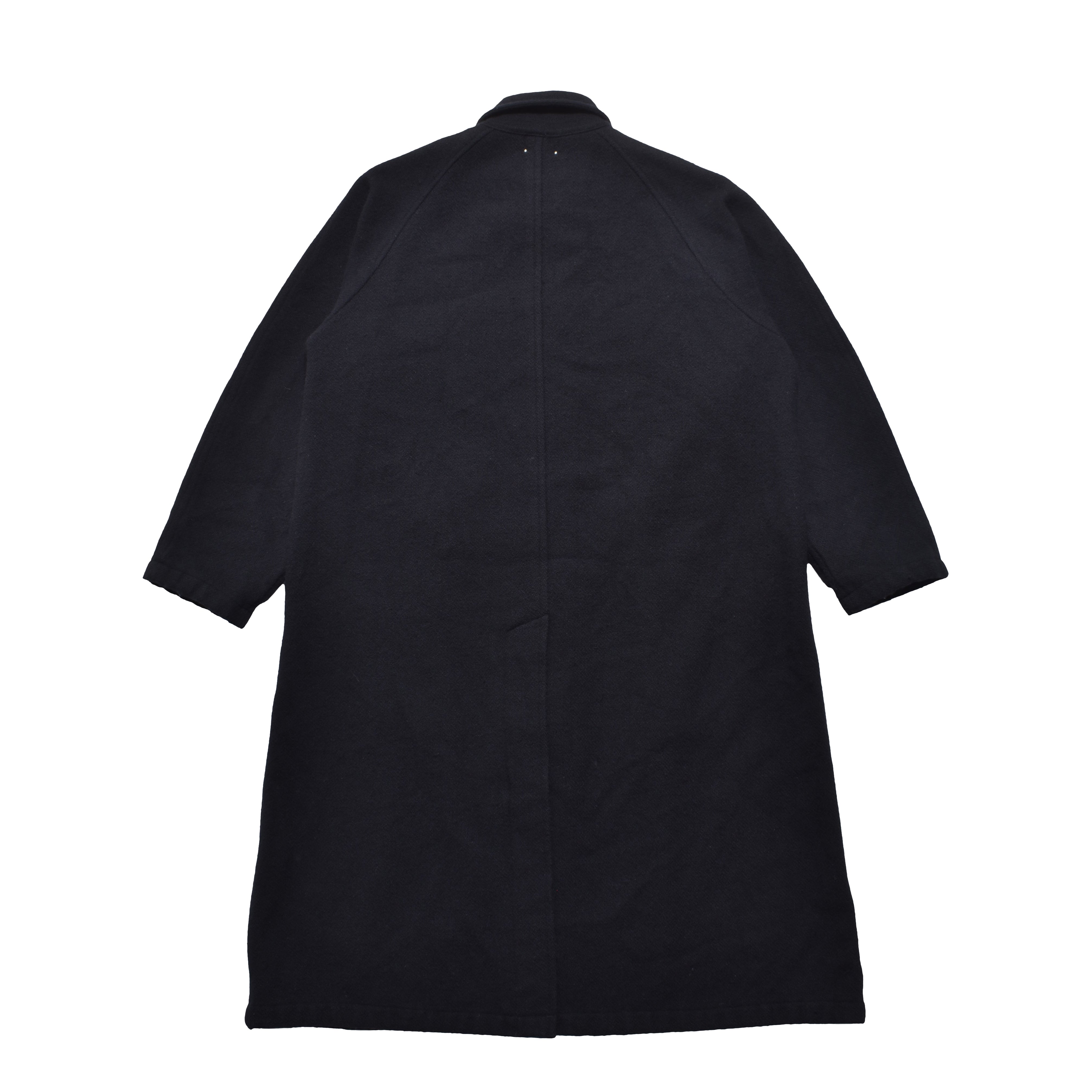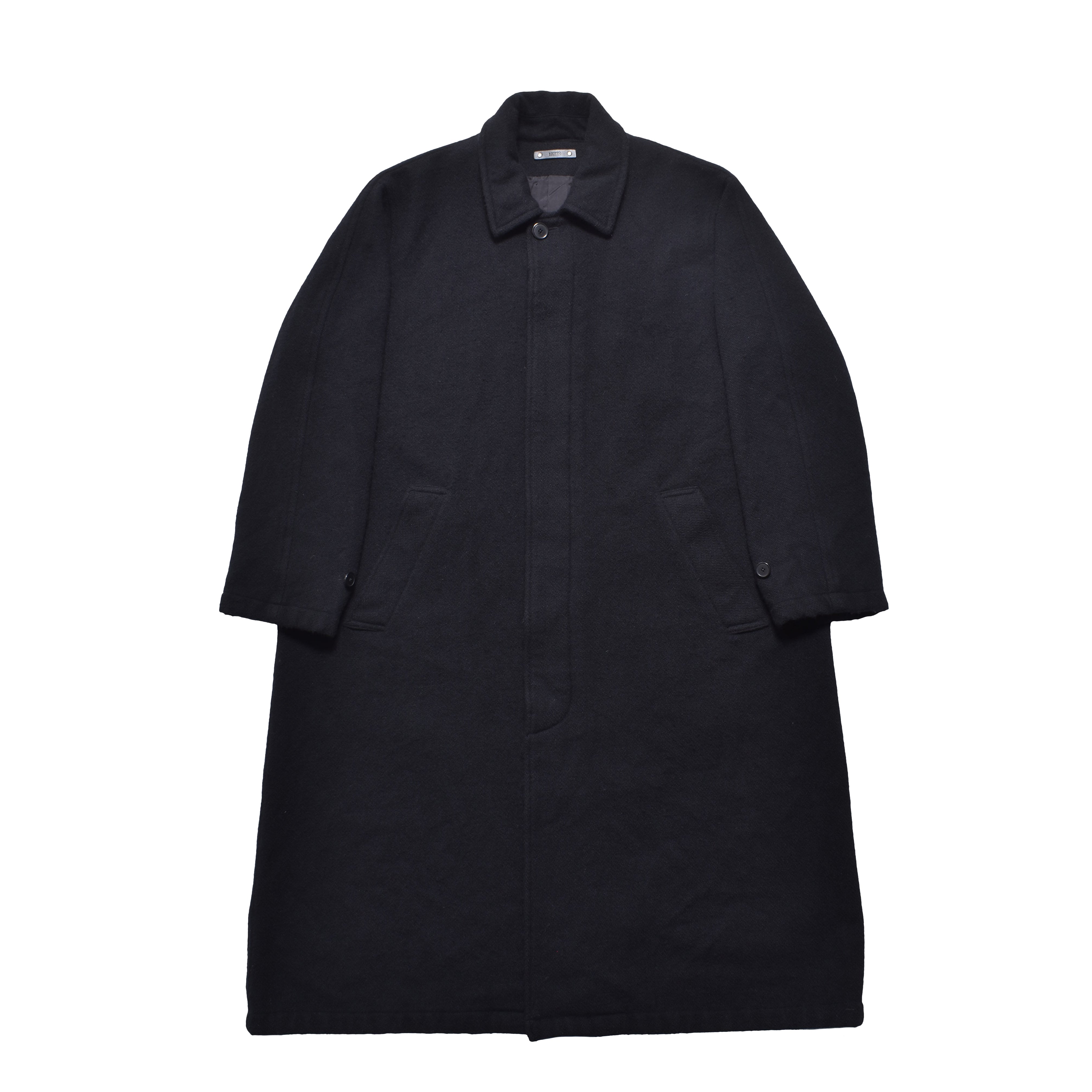 表情が特徴的な甘織りのウールメルトンに縮絨加工を施し密度を高めることで柔らかな風合いを持たせ、ドレープ感がエレガントなゆったりとしたシルエットのコートに落とし込んだ。