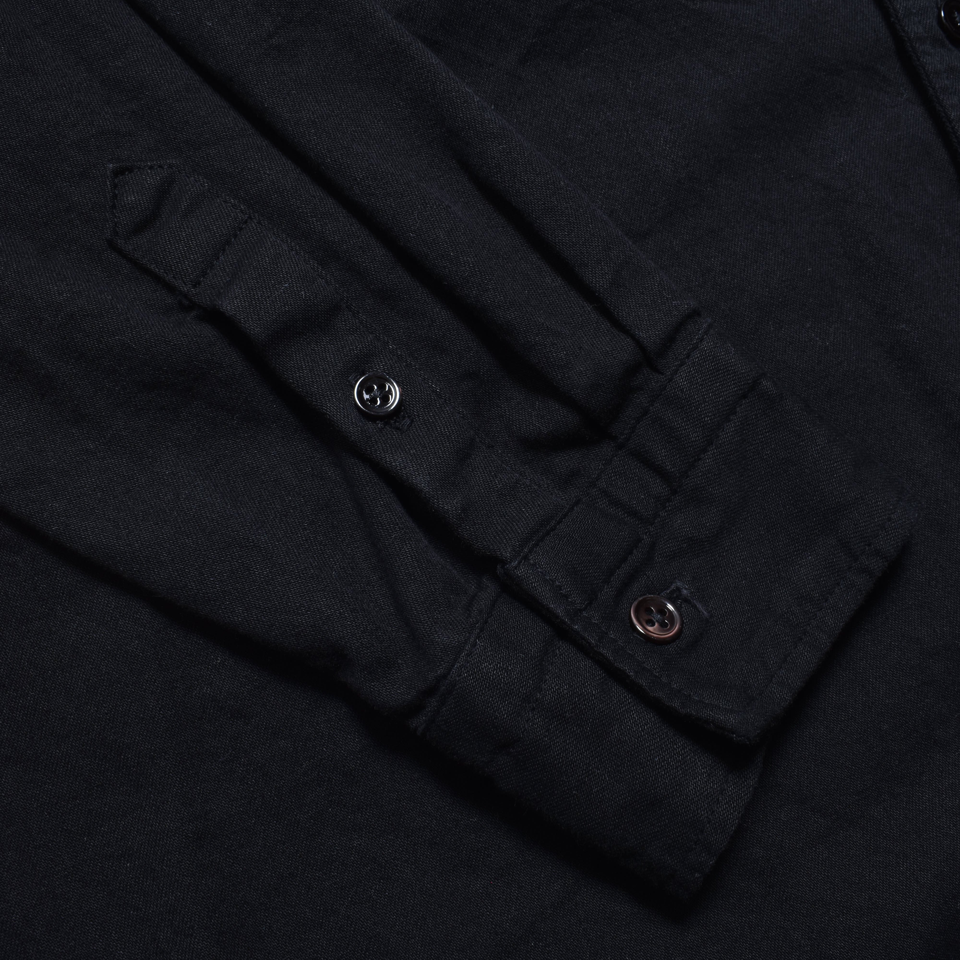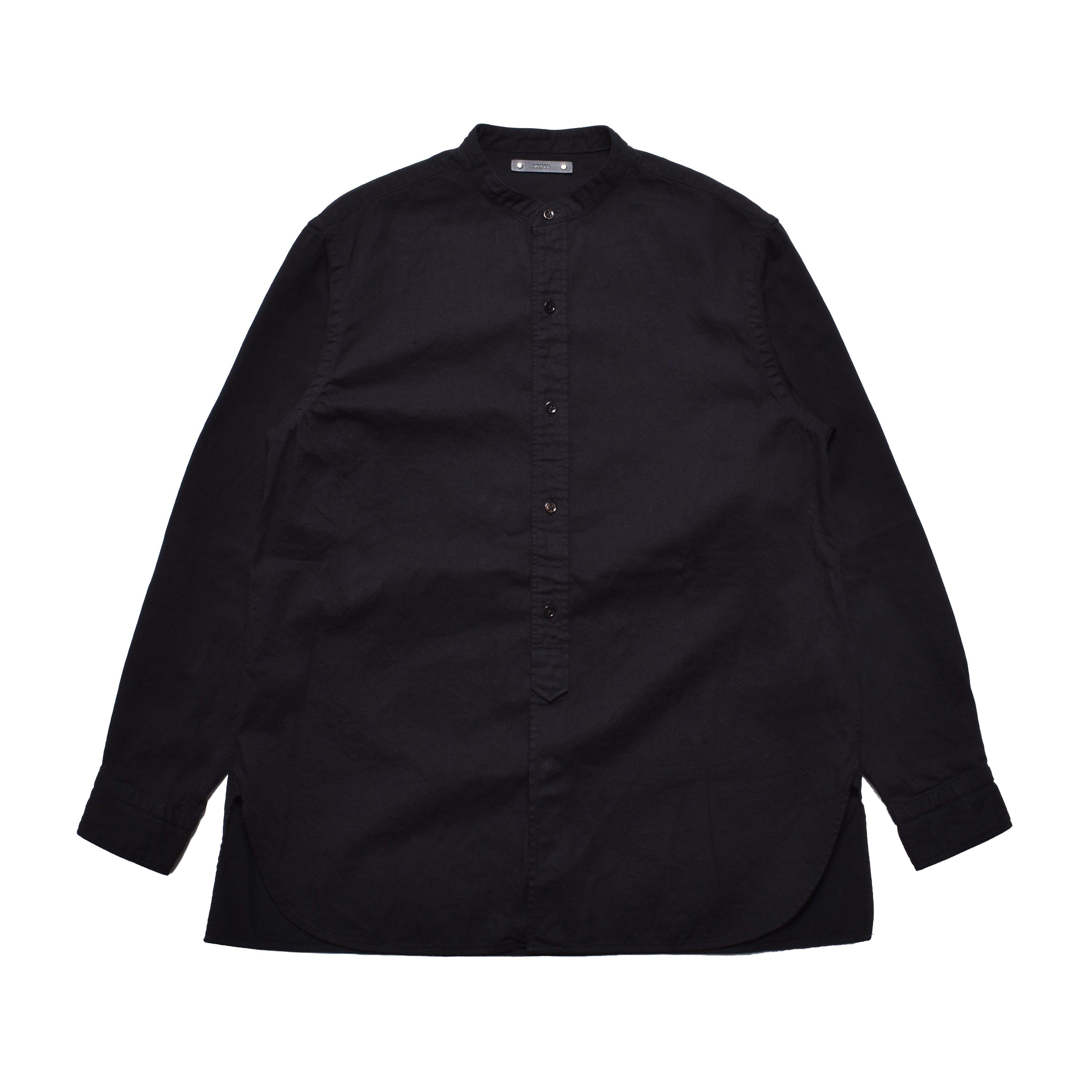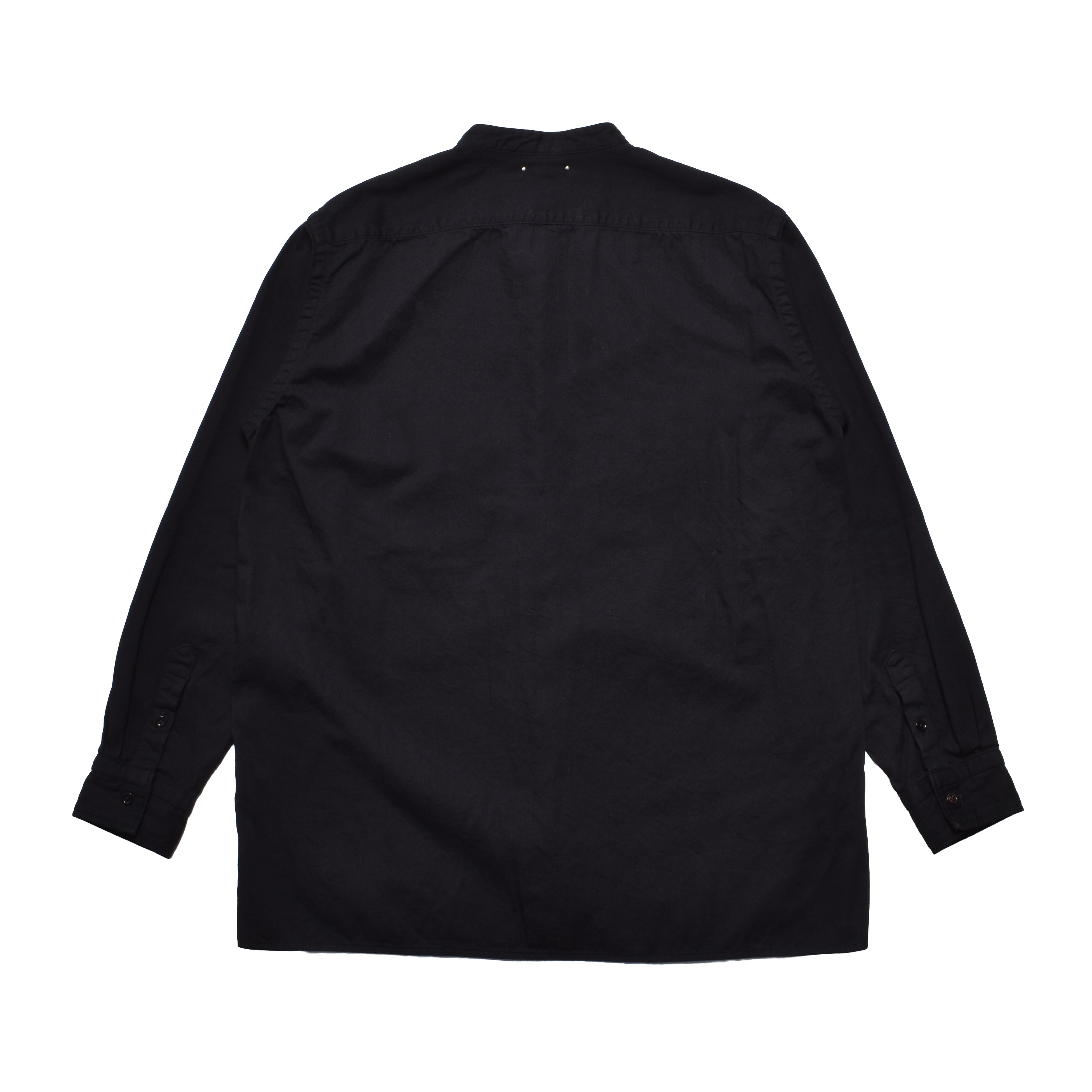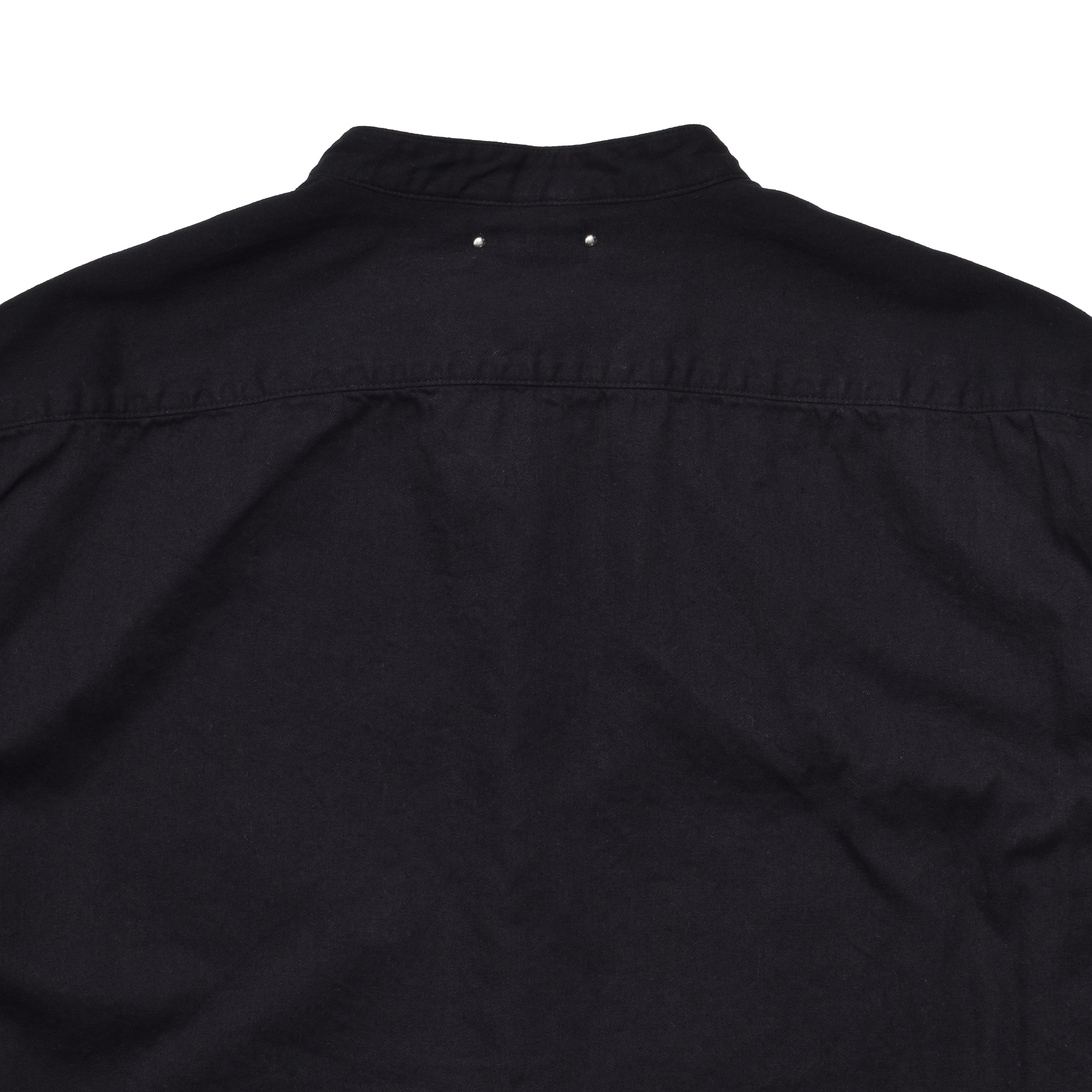 経糸、緯糸ともにブラックで織り上げた重厚感のあるバンドカラーシャツ。