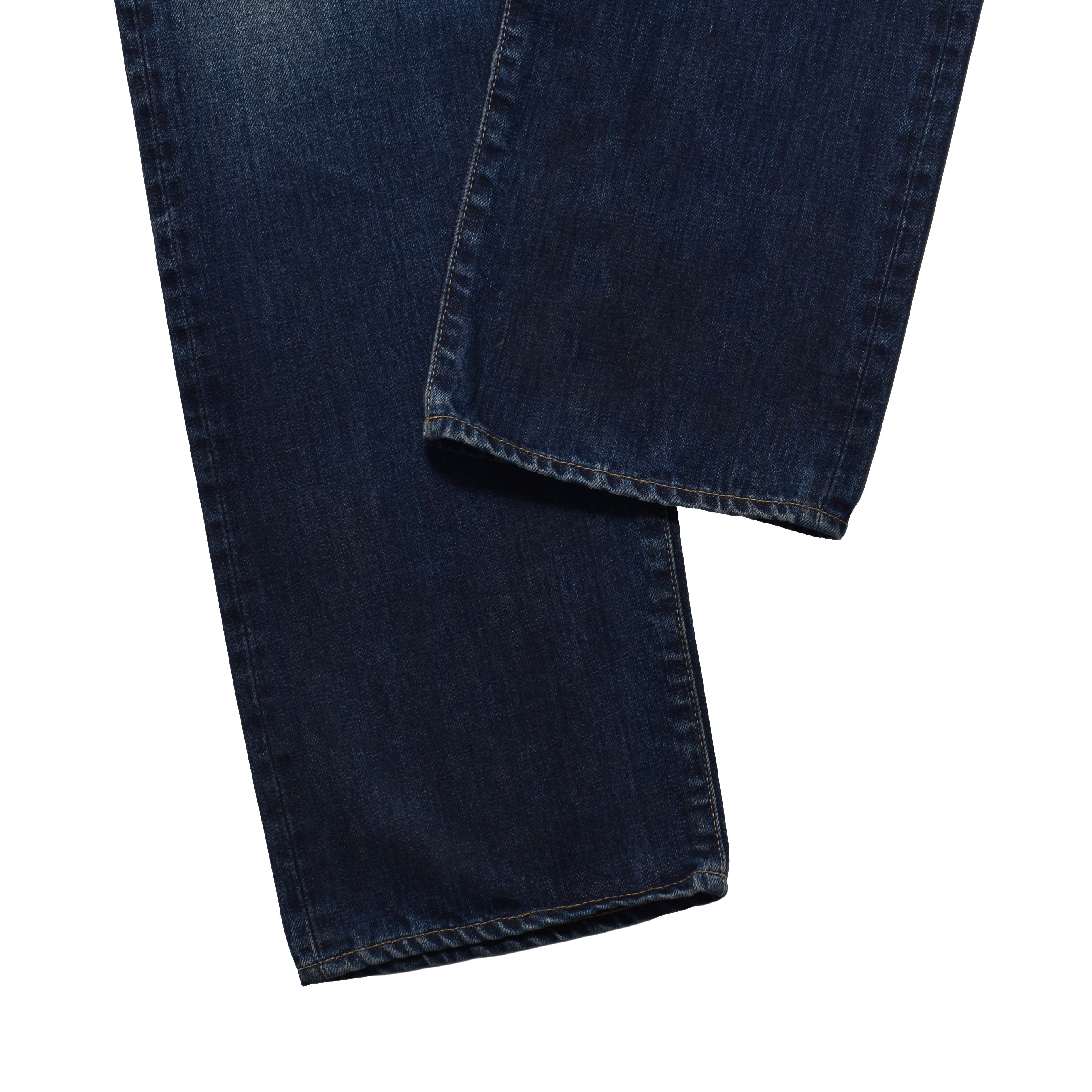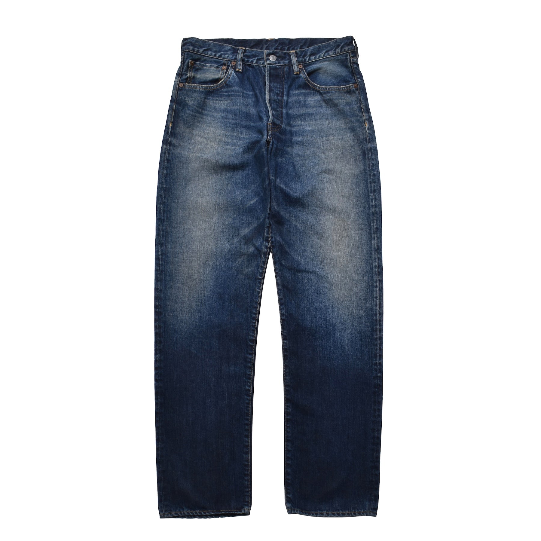 やや濃色に残したベースウォッシュとリアルな表情のUSED加工を施したルーズストレート5ポケットジーンズ。
